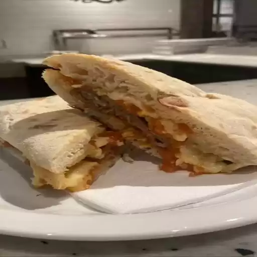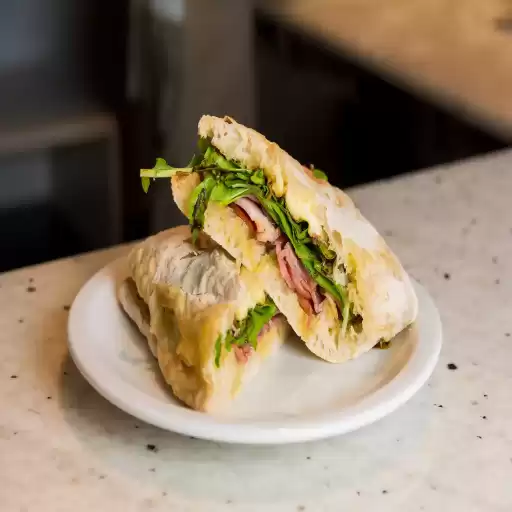 Sanduiche de calabresa, bacon, queijo, muçarela, rúcula, aceto balsâmico reduzido, parmesão ralado.