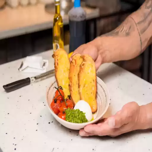 Sanduiche de alho assado, rúcula, burrata, pimenta do reino, presunto de parma e limão siciliano