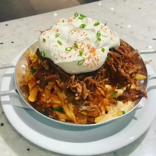 Batata frita temperada com ervas e especiarias, maionese picante dibuteco, sour cream, cupim desfiado, finalizado com p... Ver completo