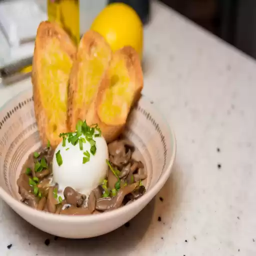 Burrata de búfala servida na cama de cogumelos, shitake e shimeji salteados na manteiga e vinho tinto.