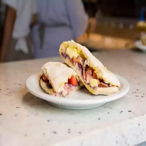 sanduiche de presunto royale, ovo caipira, cebola roxa, muçarela e ervilha fresca.